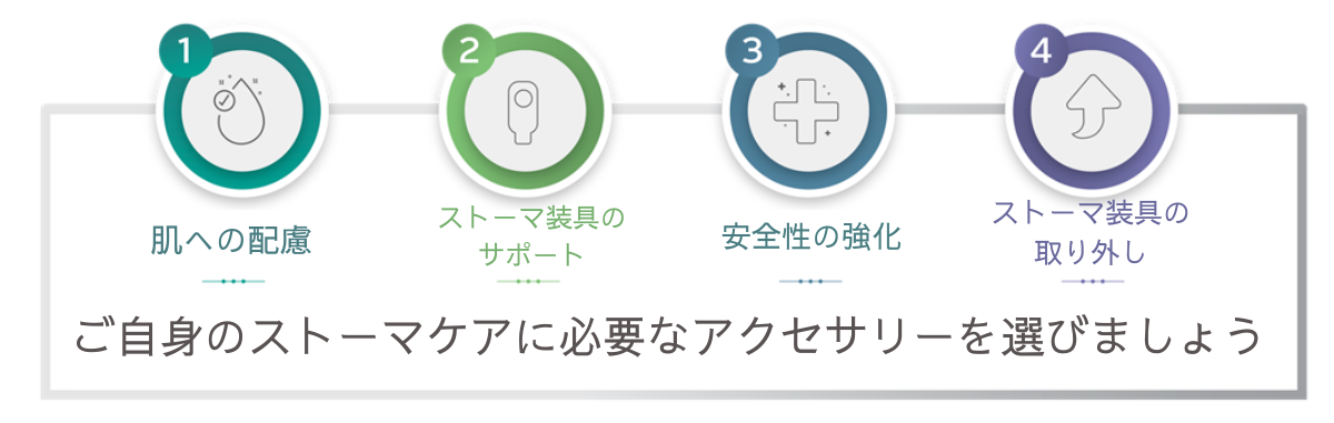 耐久性のある皮膚保護をお望みの場合でも、ストーマ装具の安全性を強化する場合でも、適切なアクセサリーを組み合わせることで、より快適で安心なストーマ装具の装着が可能になります。